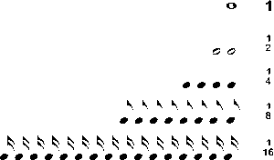 Para dejarlo un poco más claro, una redonda tiene una duración o valor equivalente a 2 blancas, que equivalen a 4 negras, que a su vez equivalen a 8 corcheas que equivalen a 16 semicorcheas y así sucesivamente.   Esto sería lo mismo que decir que la redonda vale 1, la blanca un medio ½, la negra un cuarto ¼, la corchea un octavo 1/8.